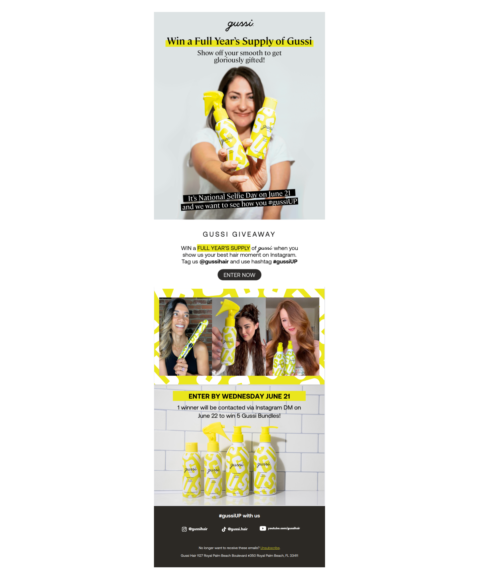 You can use UGC in re-engagement marketing emails and regular newsletters. Try running giveaway campaigns like Gussi below to encourage users to share their content.